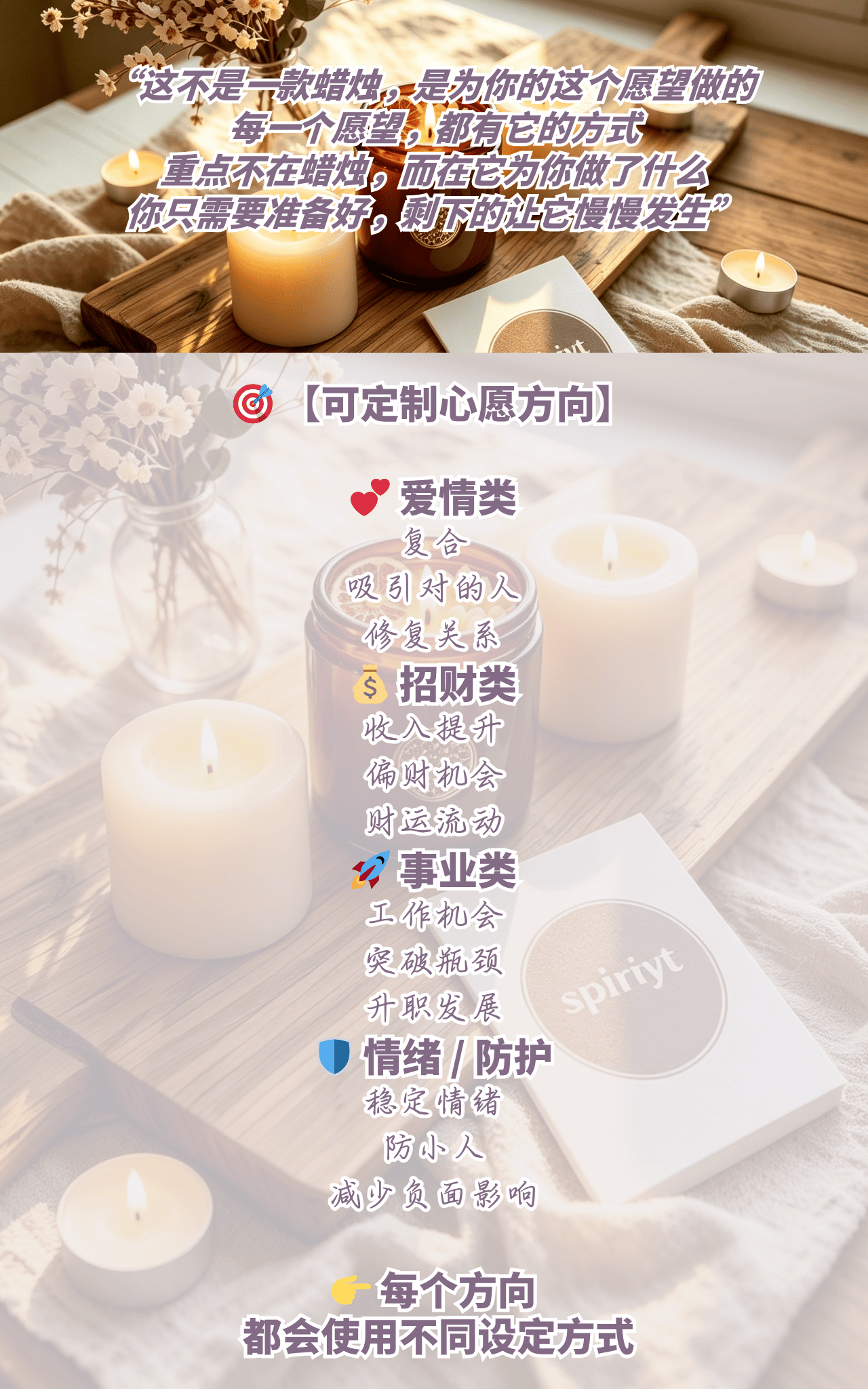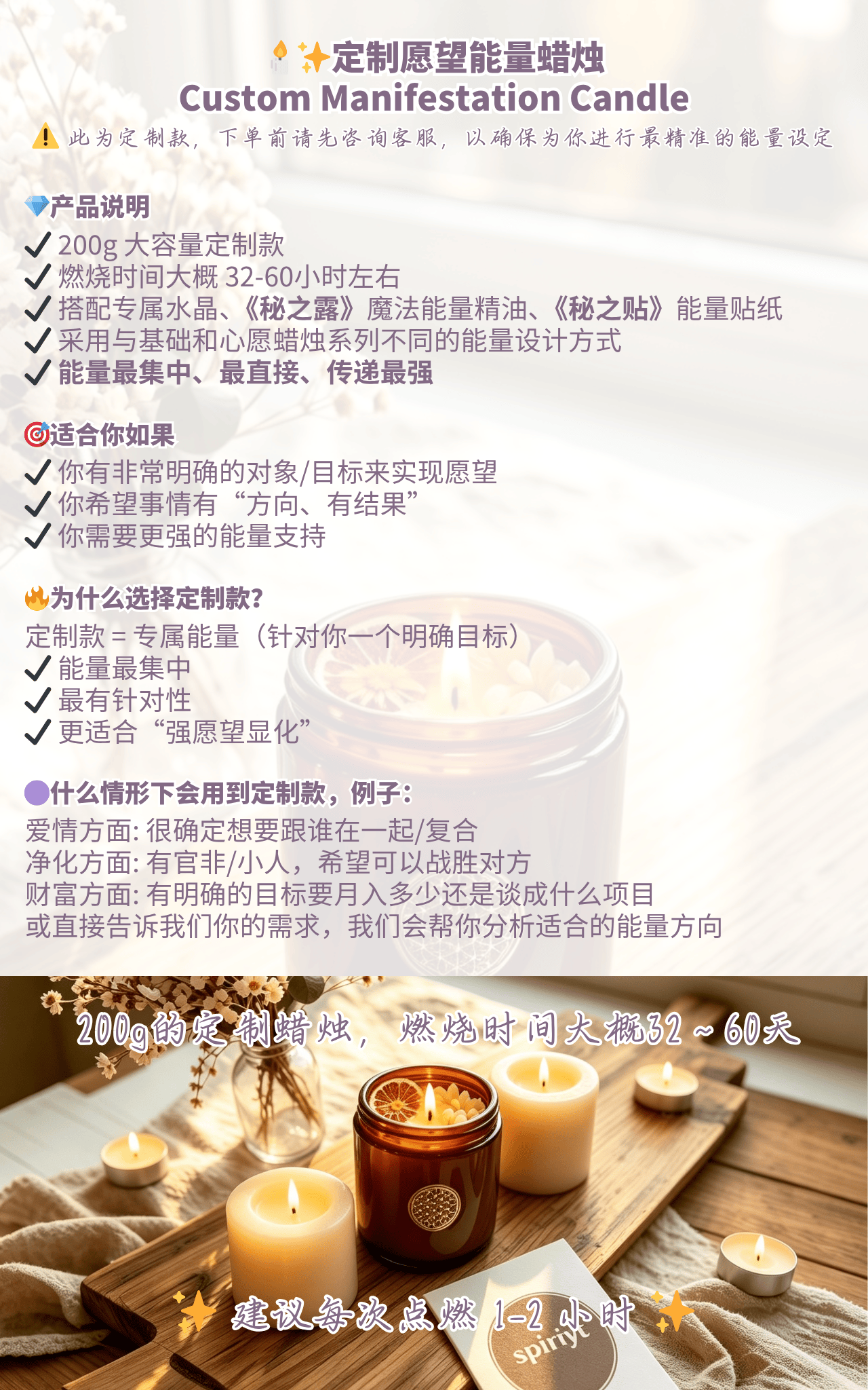 不是因为“魔法比较猛”,而是因为它围绕的目标更明确、更专属,准备过程也更集中。如果你的愿望本身就很具体,定制蜡烛通常会比一般大方向产品更能承接那份专注。