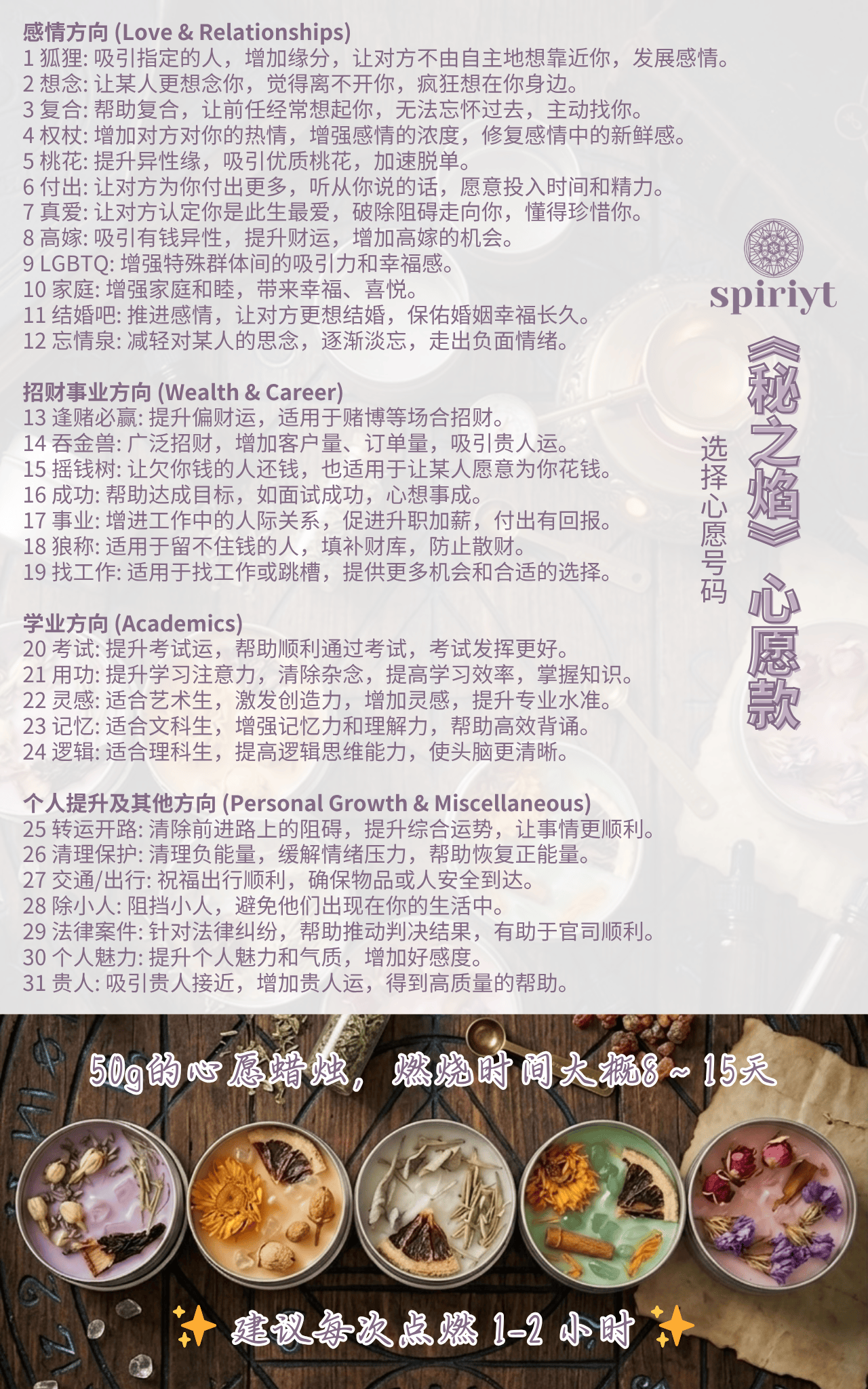 心愿蜡烛不是大方向型蜡烛,而是围绕更明确、更有针对性的心愿去准备。适合你已经知道自己要的是什么,例如复合、考试、找工作、贵人、清理保护、转运等。